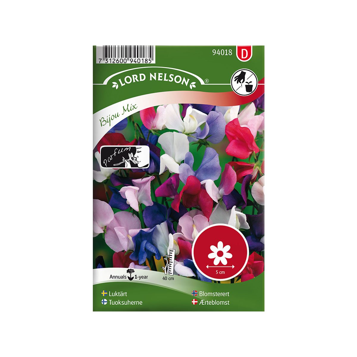 En lavtvoksende og velduftende blanding av kompakte blomstererter. Blandingen inneholder rosa, røde, blå, fiolette, og hvite nyanser. Trives i næringsrik og veldrenert jord. Gi vann og næring regelmessig. Klipp bort visne blomster etter hvert, så blir blomstringen rikeligere. Bløtlegg frøene et par timer før såing.