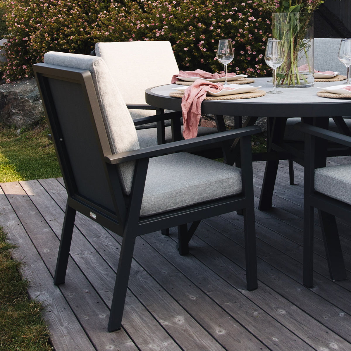 Samvaro spisegruppe er en flott spisegruppe for sommerens mange utemåltider. Komfortable stoler og et rundt bord skaper en fin ramme for sosial hygge. Putene er lys grå og i stoffet olefin. Olefinstoff er svært UV- bestandig og hurtigtørkende. 3D printet glassplate.. Det kan variere fra butikk til butikk om bordplaten er lys eller mørk. Mål: Spisestol 71xD60 cm H94 cm Bord L140xD140 cm H73 cm