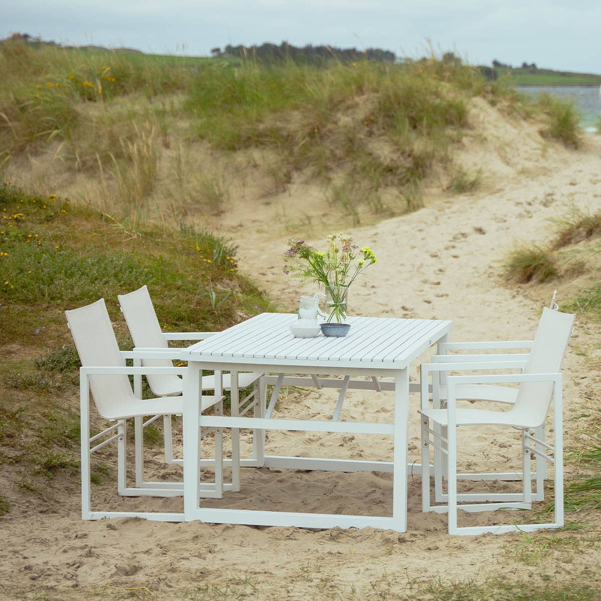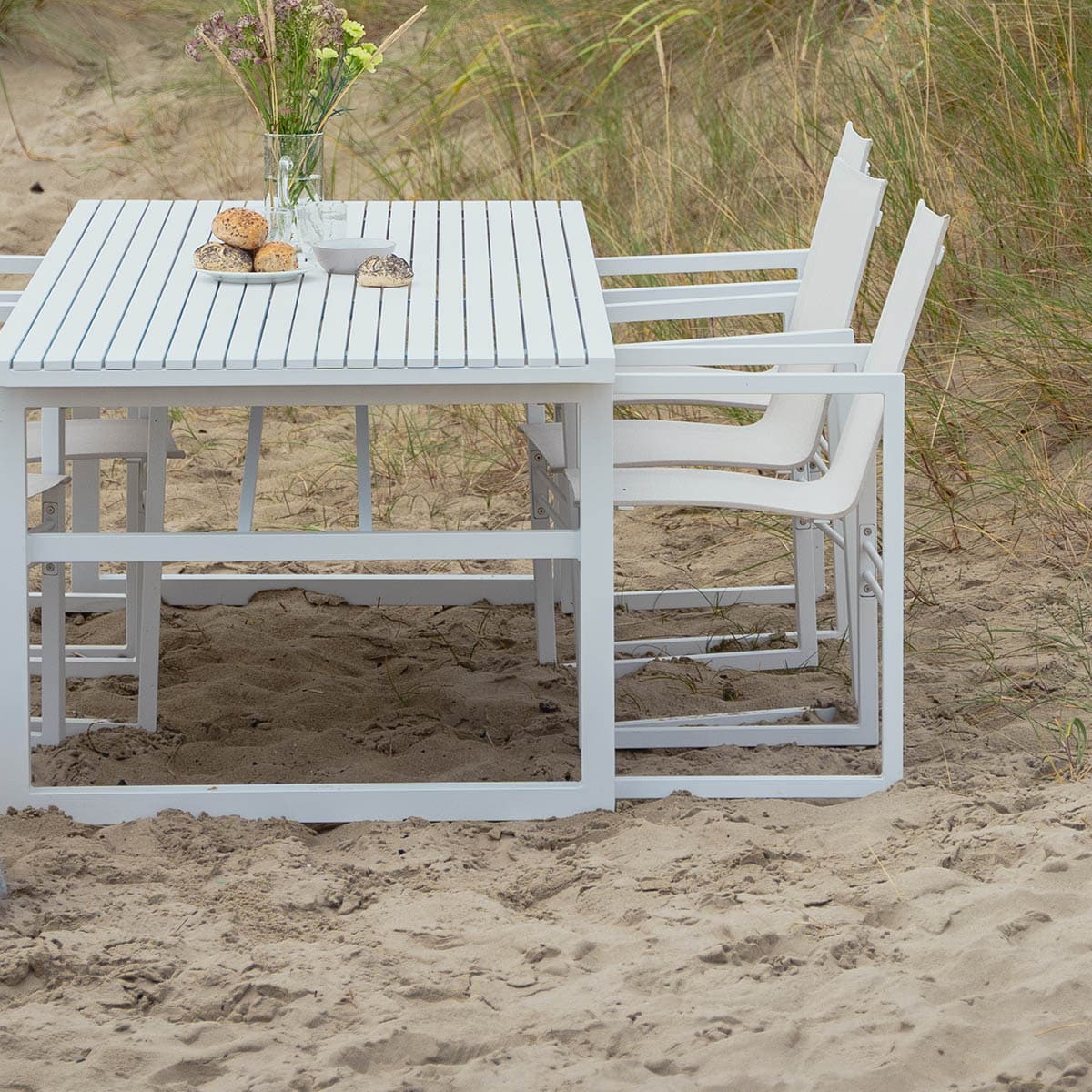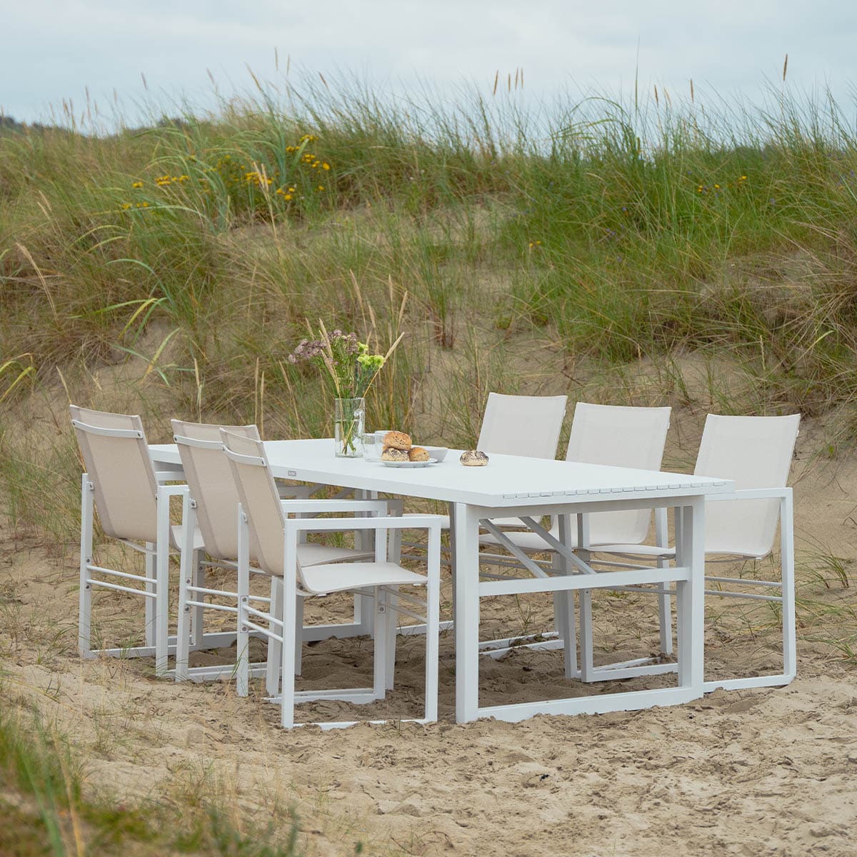 Det nordiske formspråket og det elegante, moderne uttrykket kjennetegner denne serien som er designet av Dick Björk. Fra det generøse spisebordet med plass til familie og venner til stoler og benker i samme stil. Komfortable spisestoler i aluminium med sete og rygg i textilene. Mål: Stol 56,5xD54 cm H89 cm Bord L160xD94 cm H73 cm