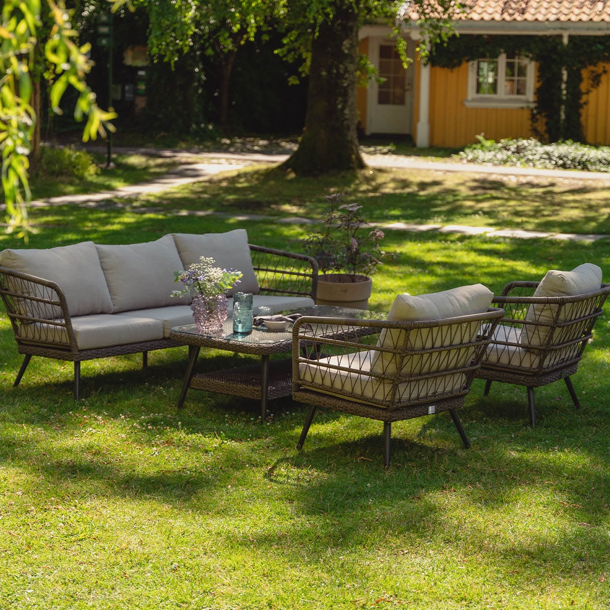 Lev livet utendørs i sommer! 3-seter sofa i rotting med et romantisk, men samtidig moderne uttrykk som passer både på balkongen, på uteplassen eller under et tre i hagen. Med ramme av pulverlakkert aluminium og åpen flett i kunstrotting, er det kun vask med mildt såpevann som kreves for at møbelet skal holde seg fint år etter år. Lattefargede puter i olefinstoff, et materiale som er svært uv-bestandig og hurtigtørkende. Vi anbefaler likevel at putene legges under tak når de regner.