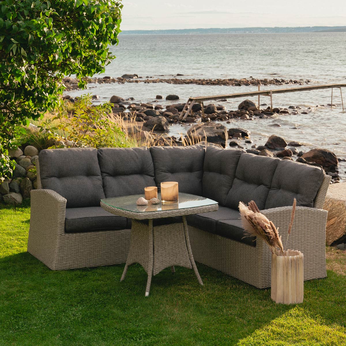Liten og nett hjørnegruppe i gråfarget halvrund kunstrotting med tilhørende bord med glassplate. Passer fint til en litt mindre terrrasse. Hjørnesofaen har god sittekomfort og kommer med grå puter i olefinstoff, som har høy lys- og fargeekthet og som i tillegg tørker fort. Mål: Hjørnesofa B204x204xD82 cm H93 cm Bord B80xD80 cm H69 cm