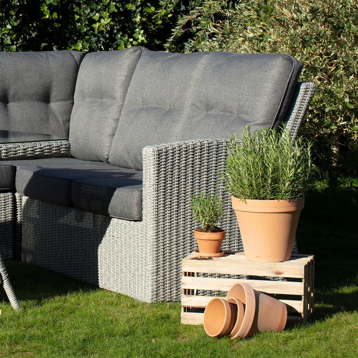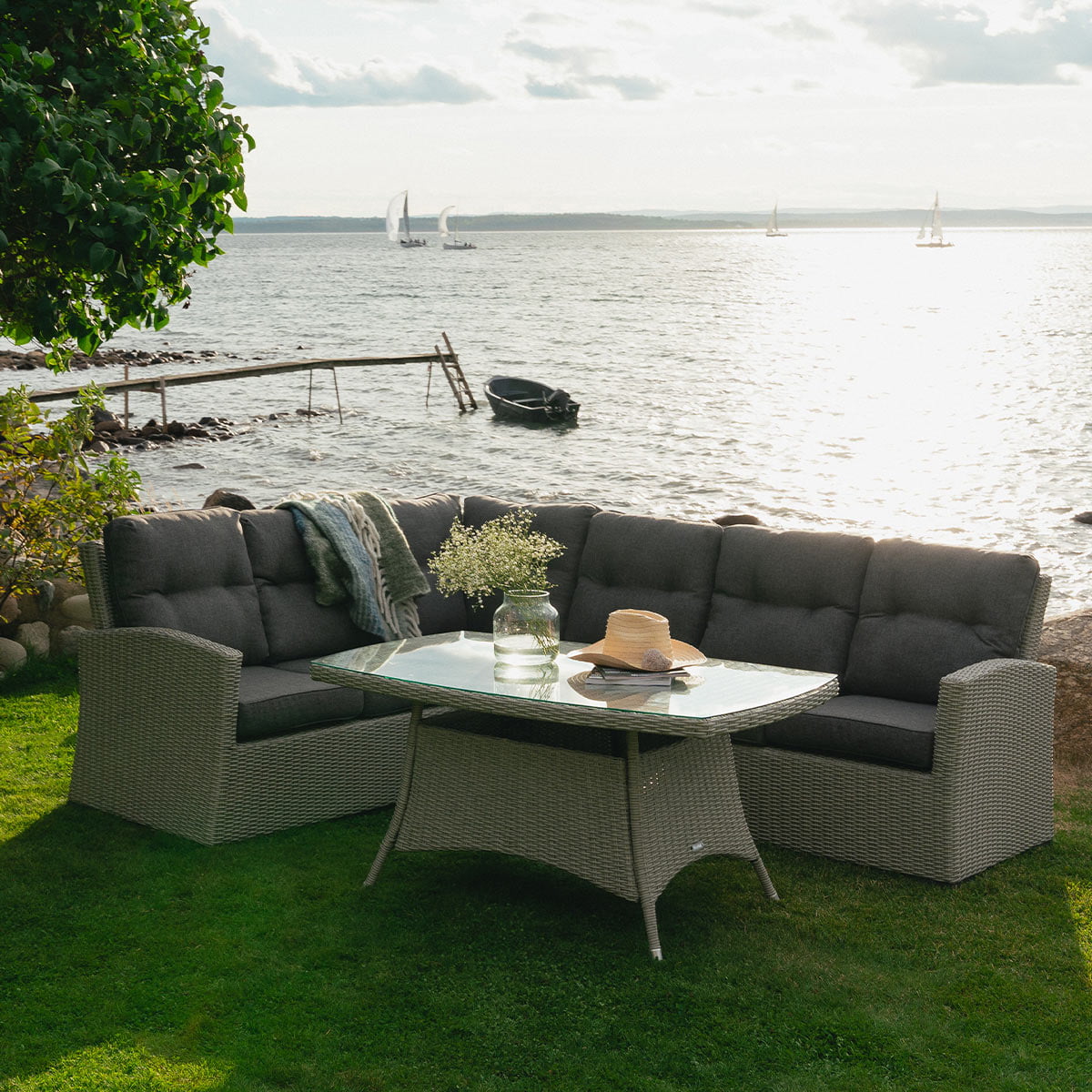 Hjørnegruppe i gråfarget halvrund kunstrotting med tilhørende bord med glassplate. Hjørnesofaen har god sittekomfort og kommer med grå puter i olefinstoff, som har høy lys- og fargeekthet og tørker fort. Mål: Hjørnesofa B262x204xD82 cm H93 cm Bord B140xD80 cm H69 cm