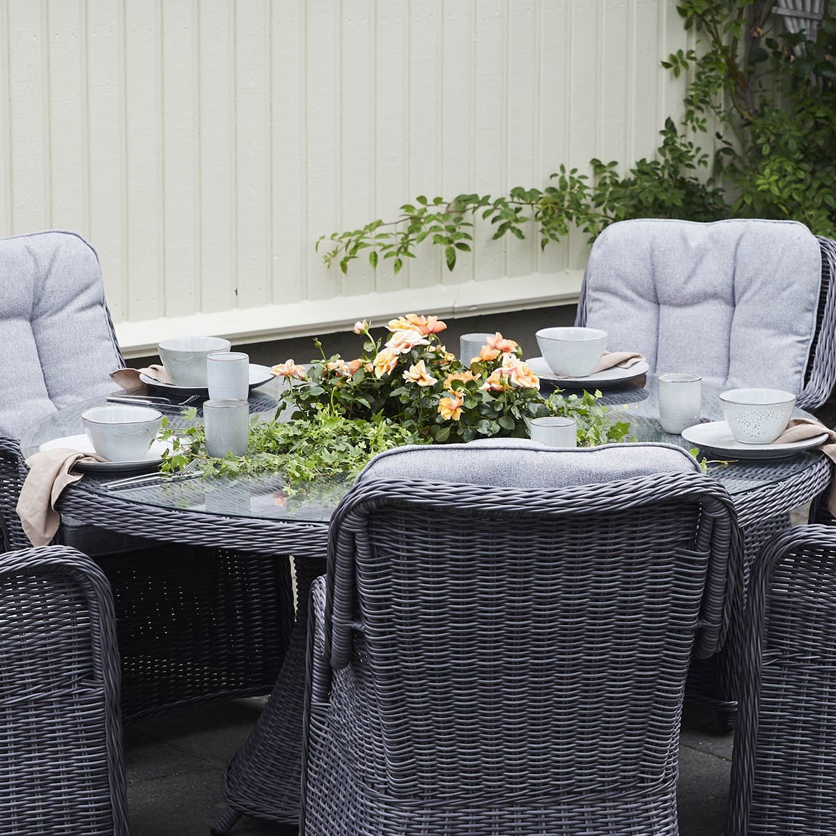 Klassisk spisestol i gråfarget halvrund/rund kunstrotting. Komfortabel lenestol med lysegrå puter laget i gjennomfarget polyester. Dette er et materiale som tåler sollys meget godt og som er svært slitesterkt og trekker til seg lite vann.Vii anbefaler likevel at de tas inn skulle det komme en regnskur.