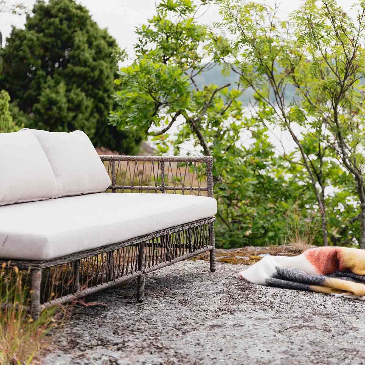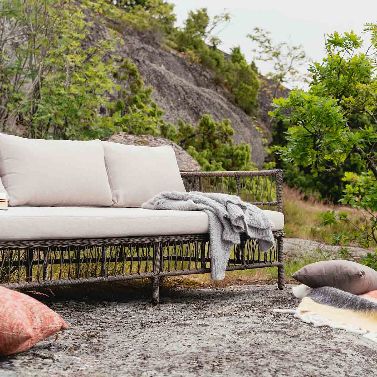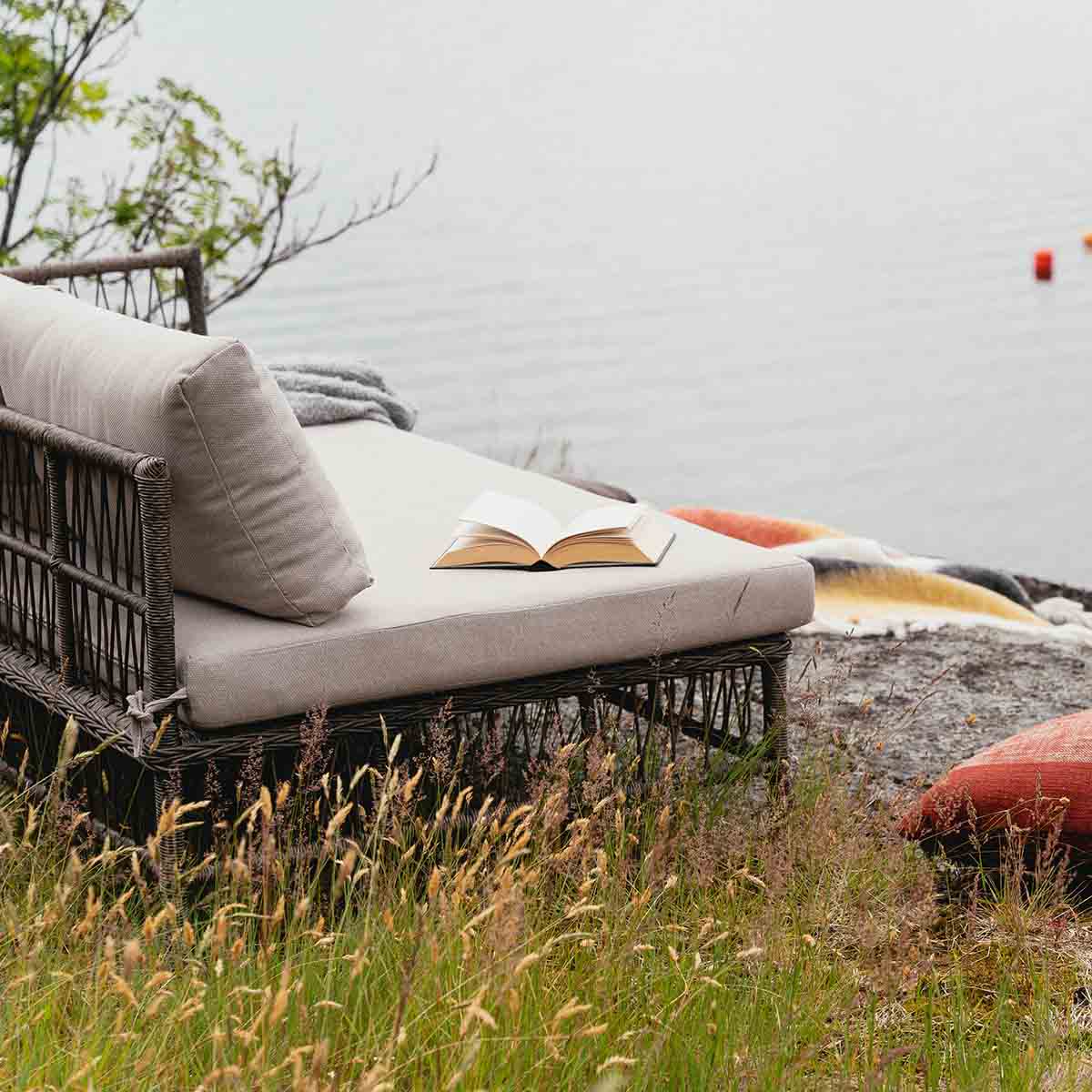 Nyt deilige sommerdager i Linnea daybed. Den åpne fletten i naturfarget kunstrotting med lyse puter gir et romantisk uttrykk. Putene kommer i olefinstoff, som har høy lys- og fargeekthet og som tørker fort.