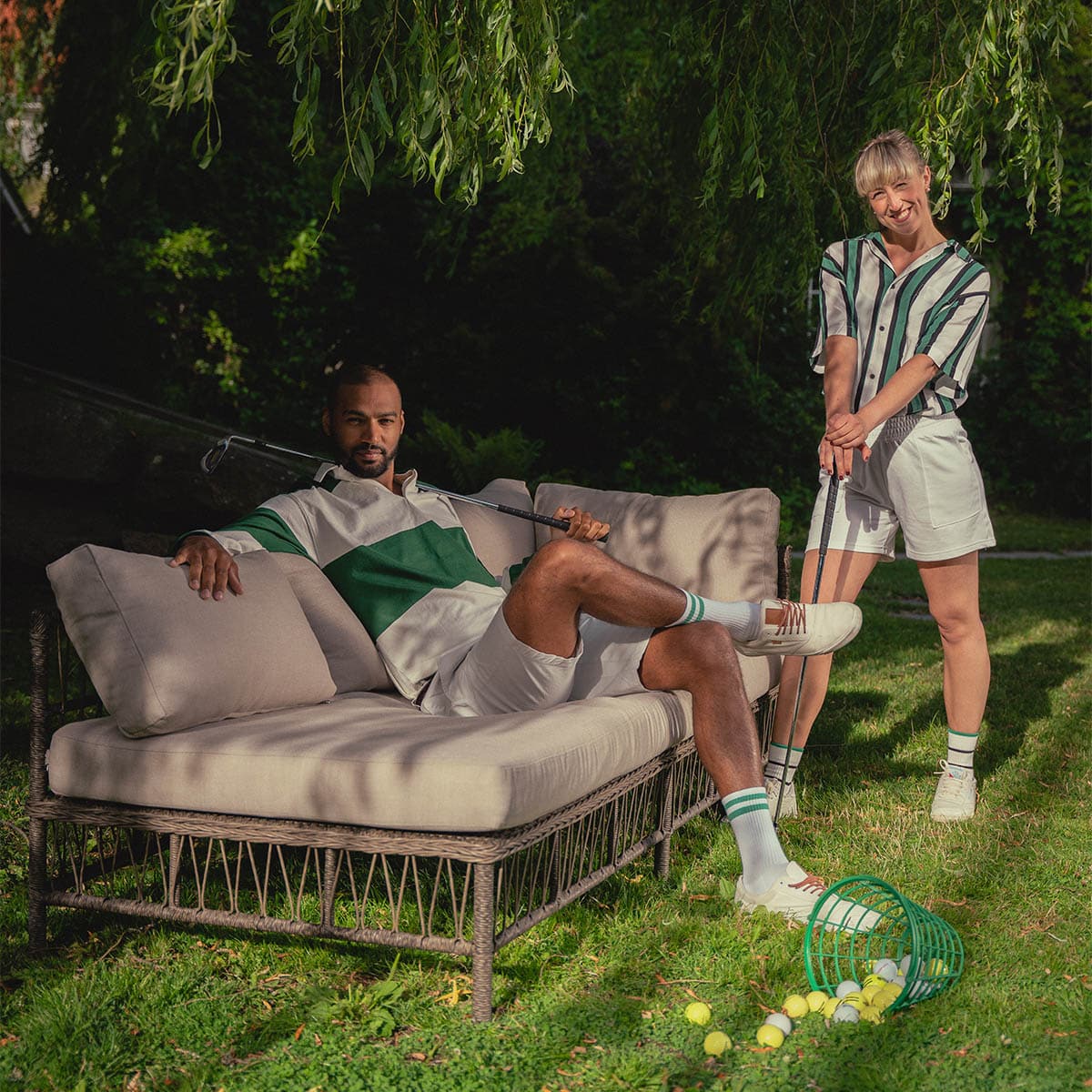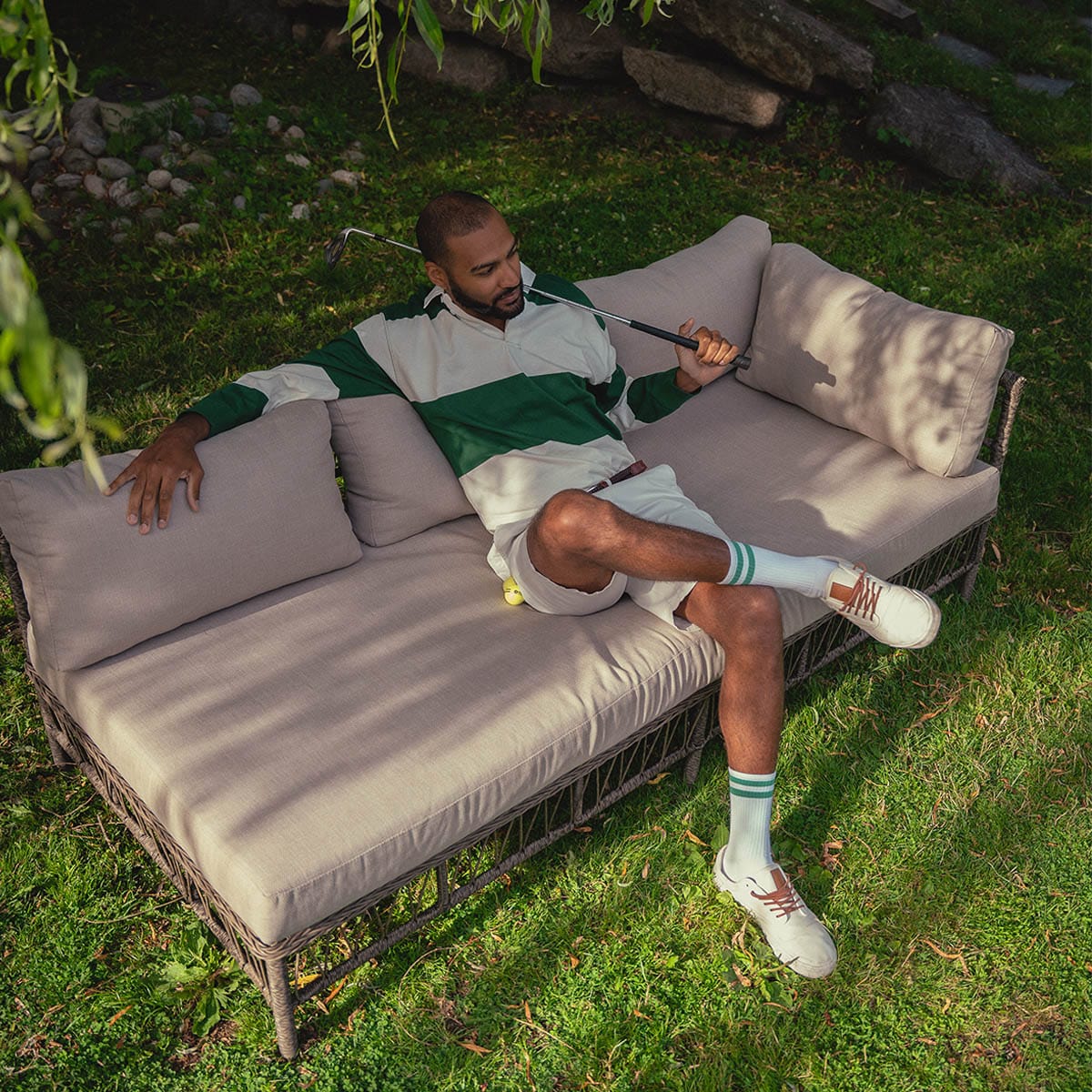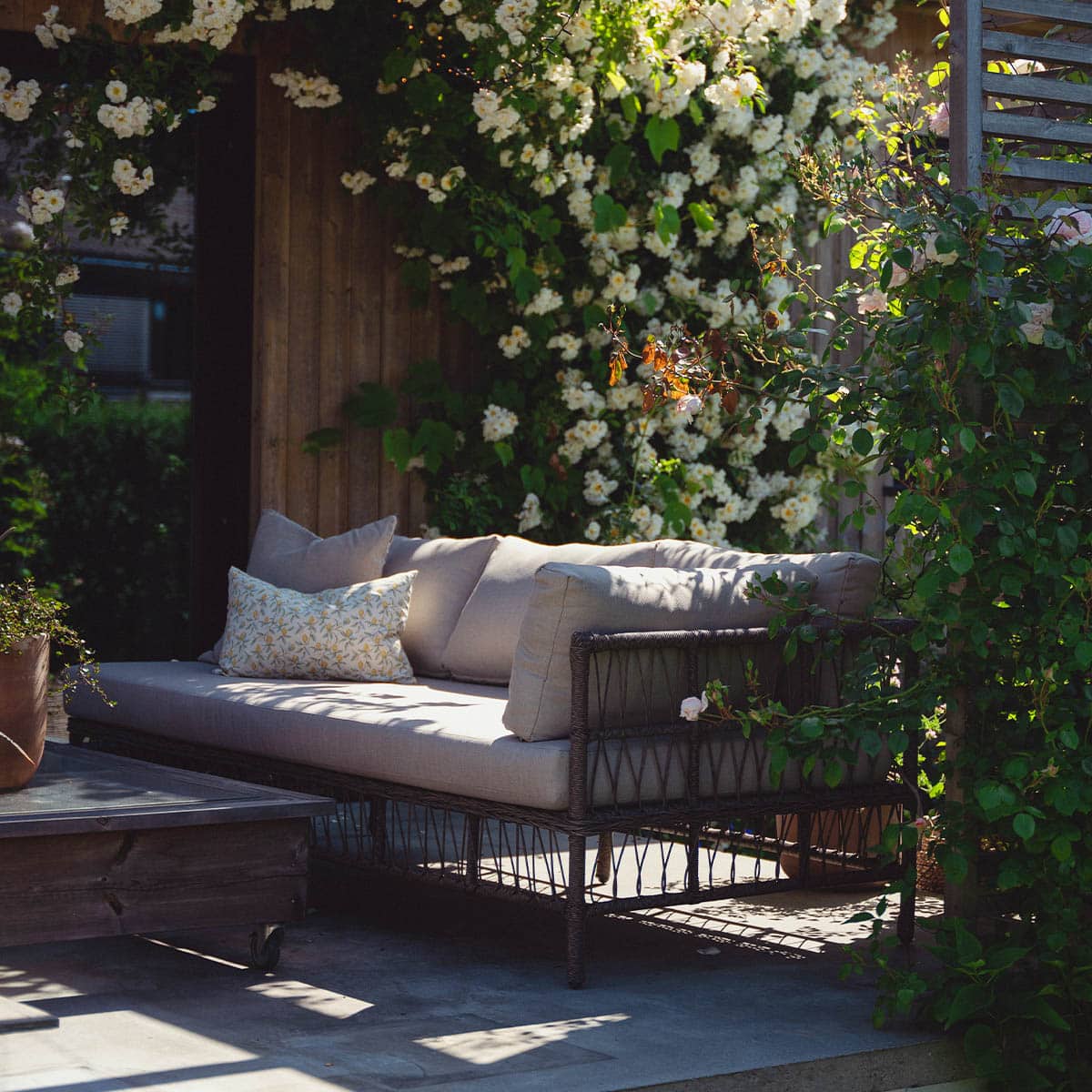 Nyt deilige sommerdager i Linnea daybed. Den åpne fletten i naturfarget kunstrotting med lyse puter gir et romantisk uttrykk. Putene kommer i olefinstoff, som har høy lys- og fargeekthet og som tørker fort.