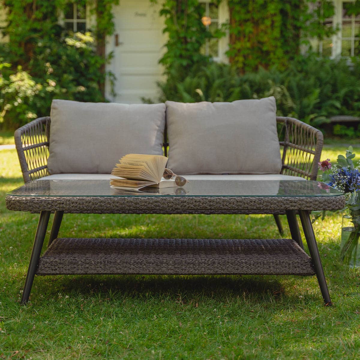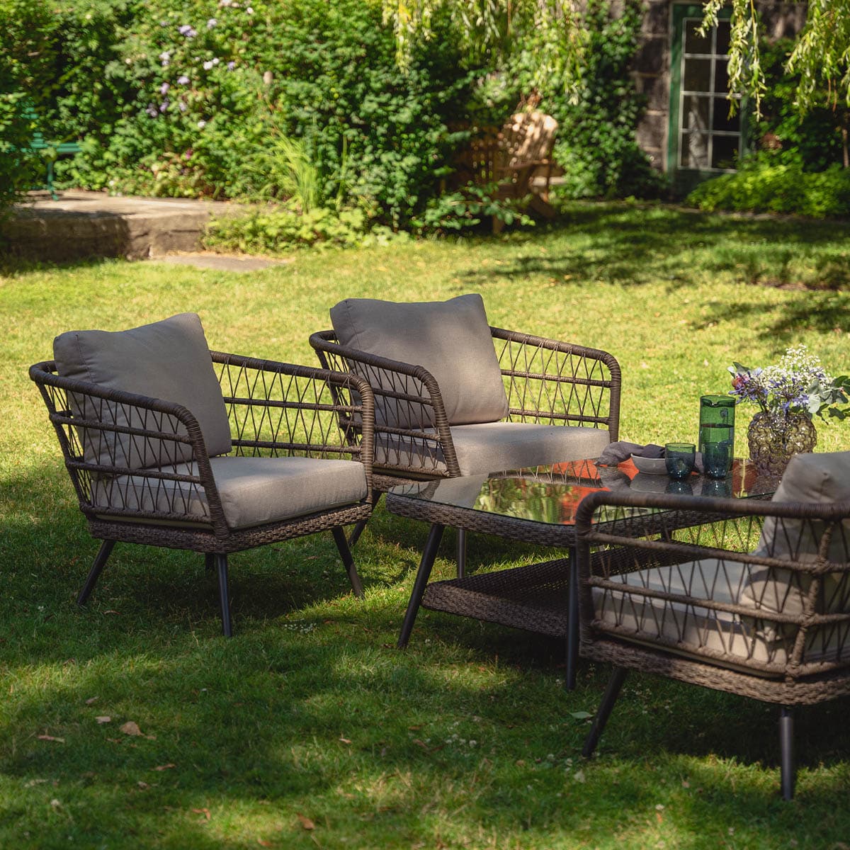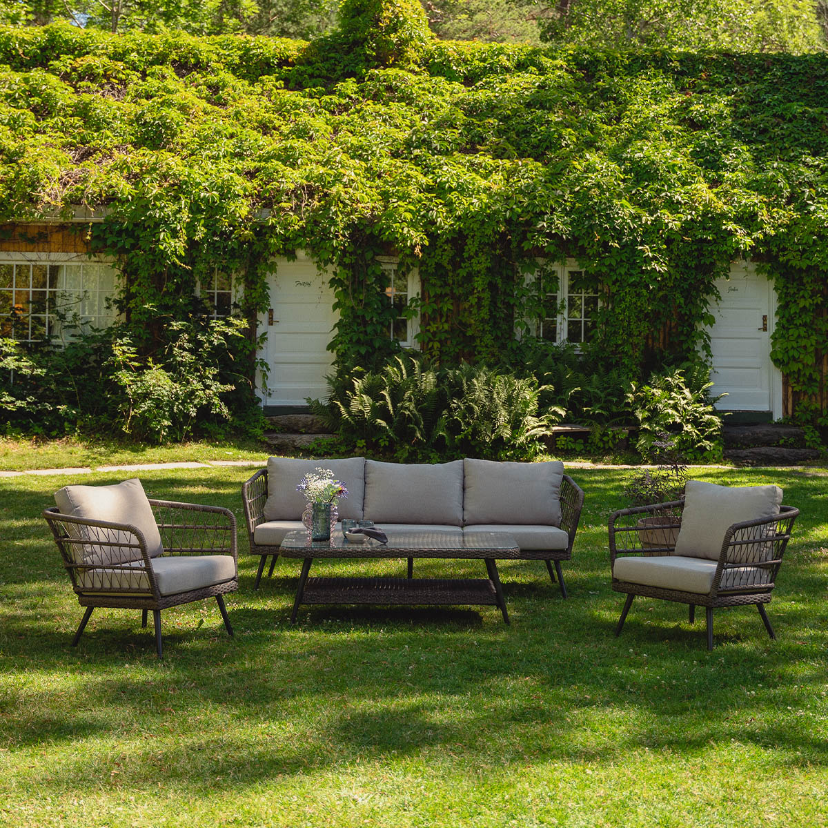 Lev livet utendørs i sommer! Komplett sofagruppe bestående av en 3-seter sofa, to komfortable lenestoler og bord med glassplate. Settet i rotting har et romantisk, men samtidig moderne uttrykk som passer både på balkongen, på uteplassen eller under et tre i hagen. Med ramme av pulverlakkert aluminium og åpen flett i kunstrotting, er det kun vask med mildt såpevann som kreves for at møblene skal holde seg fine år etter år. Lattefargede puter i olefinstoff, et materiale som er svært uv-bestandig og hurtigtørkende. Vi anbefaler likevel at putene legges under tak når de regner. Mål: Sofa L210xD74 cm H73 cm Stol L85xD74 cm H73 cm Bord 130x70 cm H45 cm