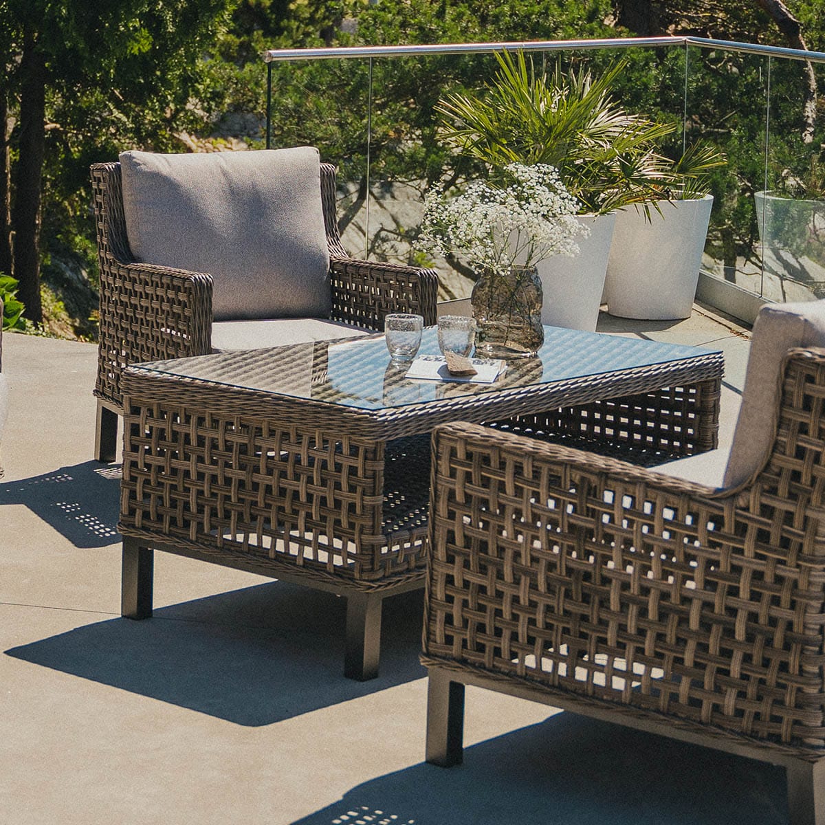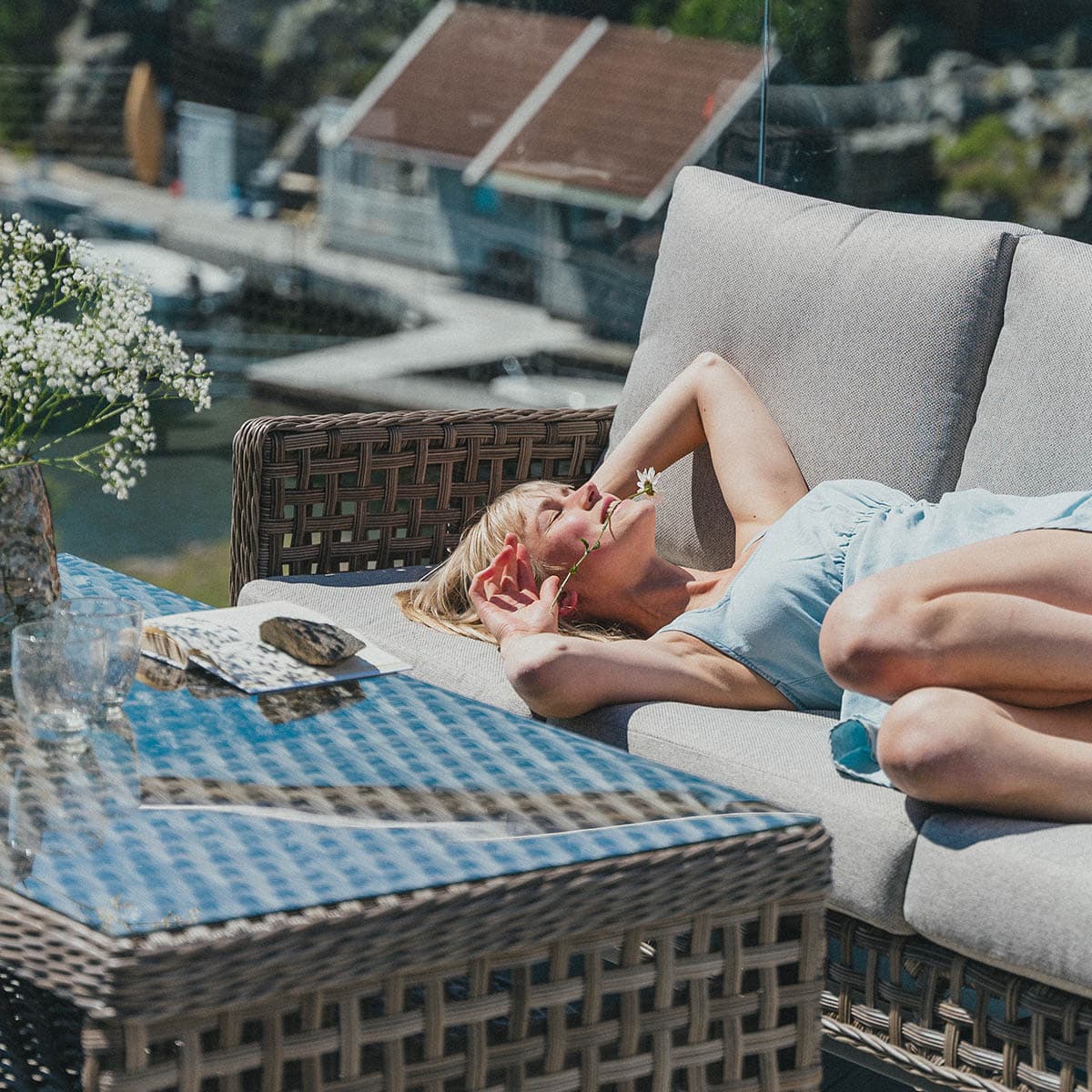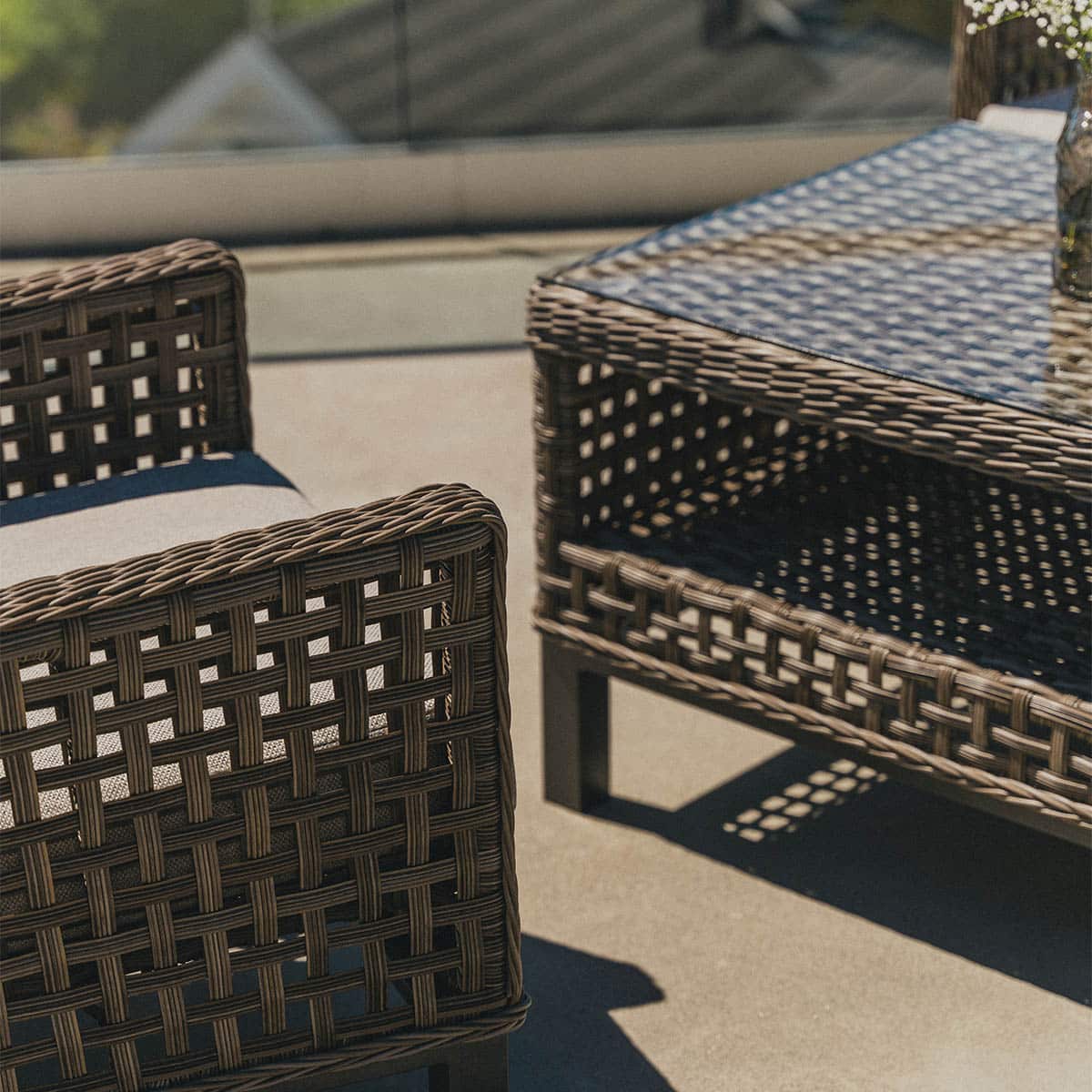 Moderne sofagruppe i driftwood farget kunstrotting med god sittekomfort. Kommer med beige puter i olefinstoff som er svært UV bestandig og tørker fort opp etter en regnskyll.