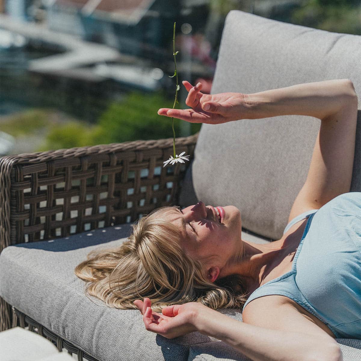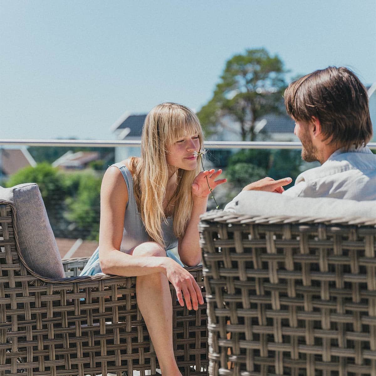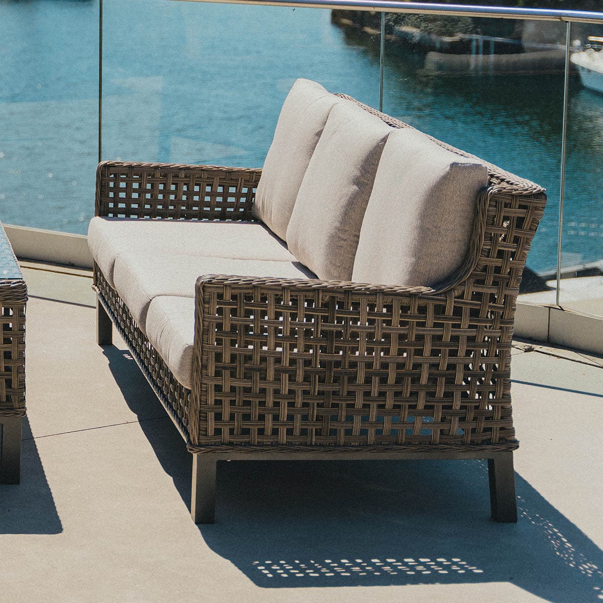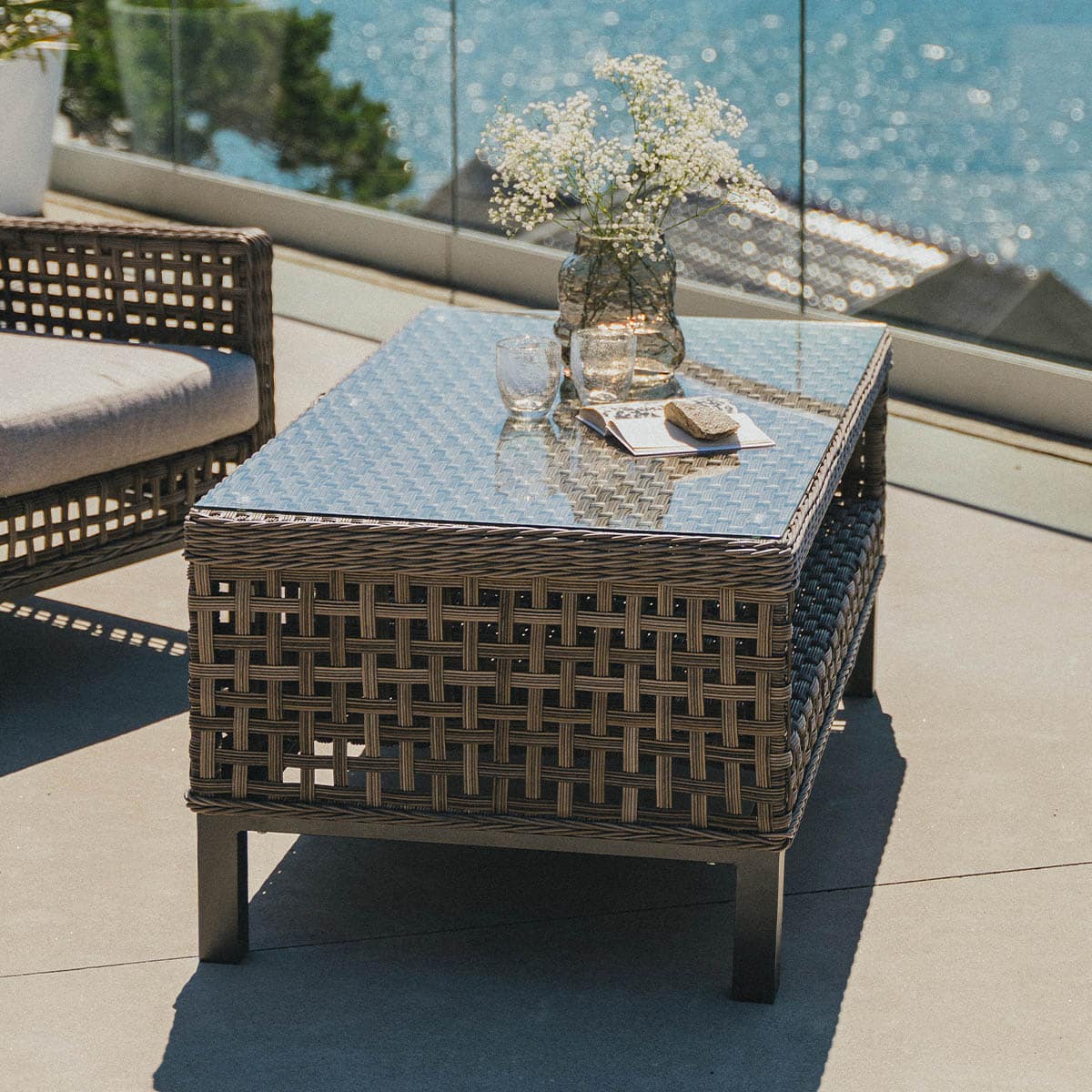 Moderne sofagruppe i driftwood farget kunstrotting med god sittekomfort. Kommer med beige puter i olefinstoff som er svært UV bestandig og tørker fort opp etter en regnskyll.
