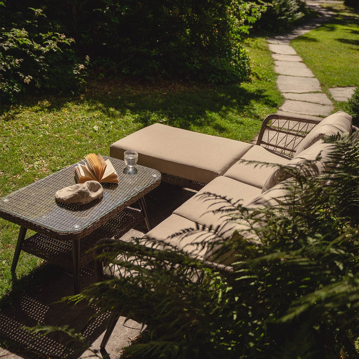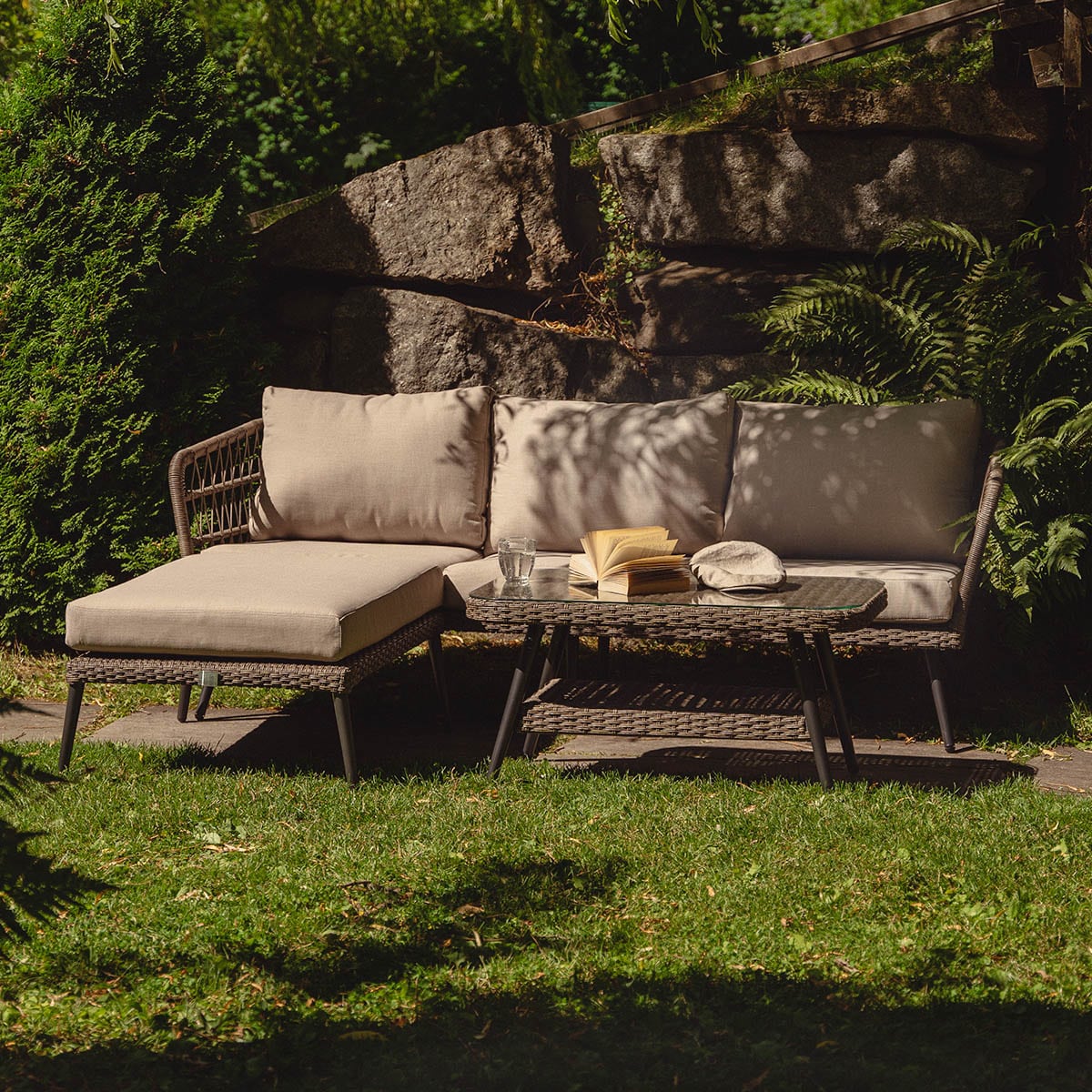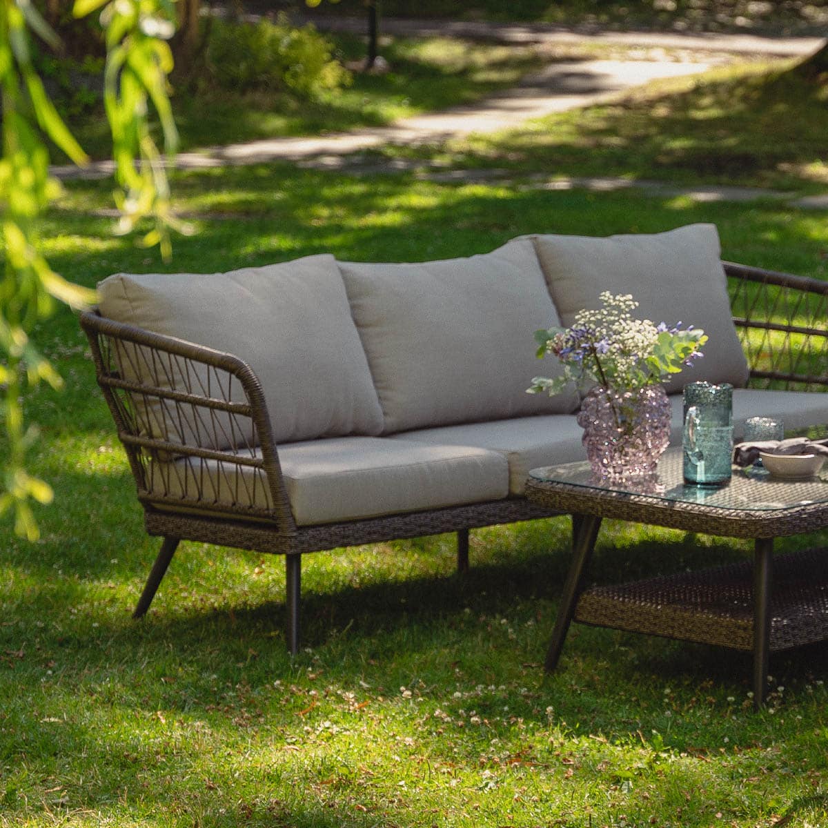 Lev livet utendørs i sommer! Sofagruppe bestående av en 3-seter sofa, sjeselongdel og bord med glassplate. Settet i rotting har et romantisk, men samtidig moderne uttrykk som passer både på balkongen, på uteplassen eller under et tre i hagen. Med ramme av pulverlakkert aluminium og åpen flett i kunstrotting, er det kun vask med mildt såpevann som kreves for at møblene skal holde seg fine år etter år. Lattefargede puter i olefinstoff, et materiale som er svært uv-bestandig og hurtigtørkende. Vi anbefaler likevel at putene legges under tak når de regner. Mål: 3-seter sofa L210xD74 cm H73 cm Sjeselongdel L60xD46 cm H45 cm Bord 90x55 cm H45 cm