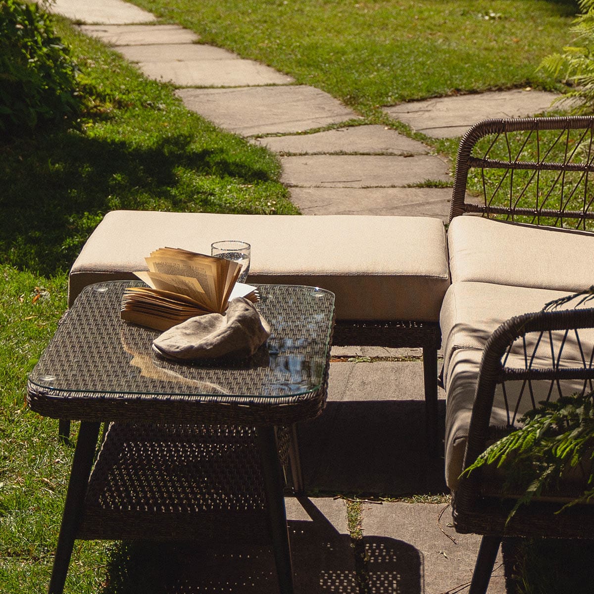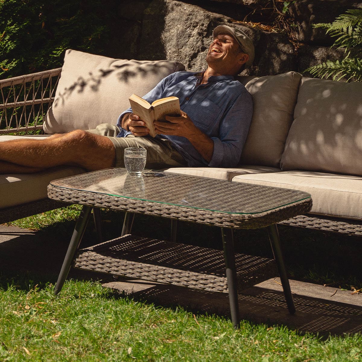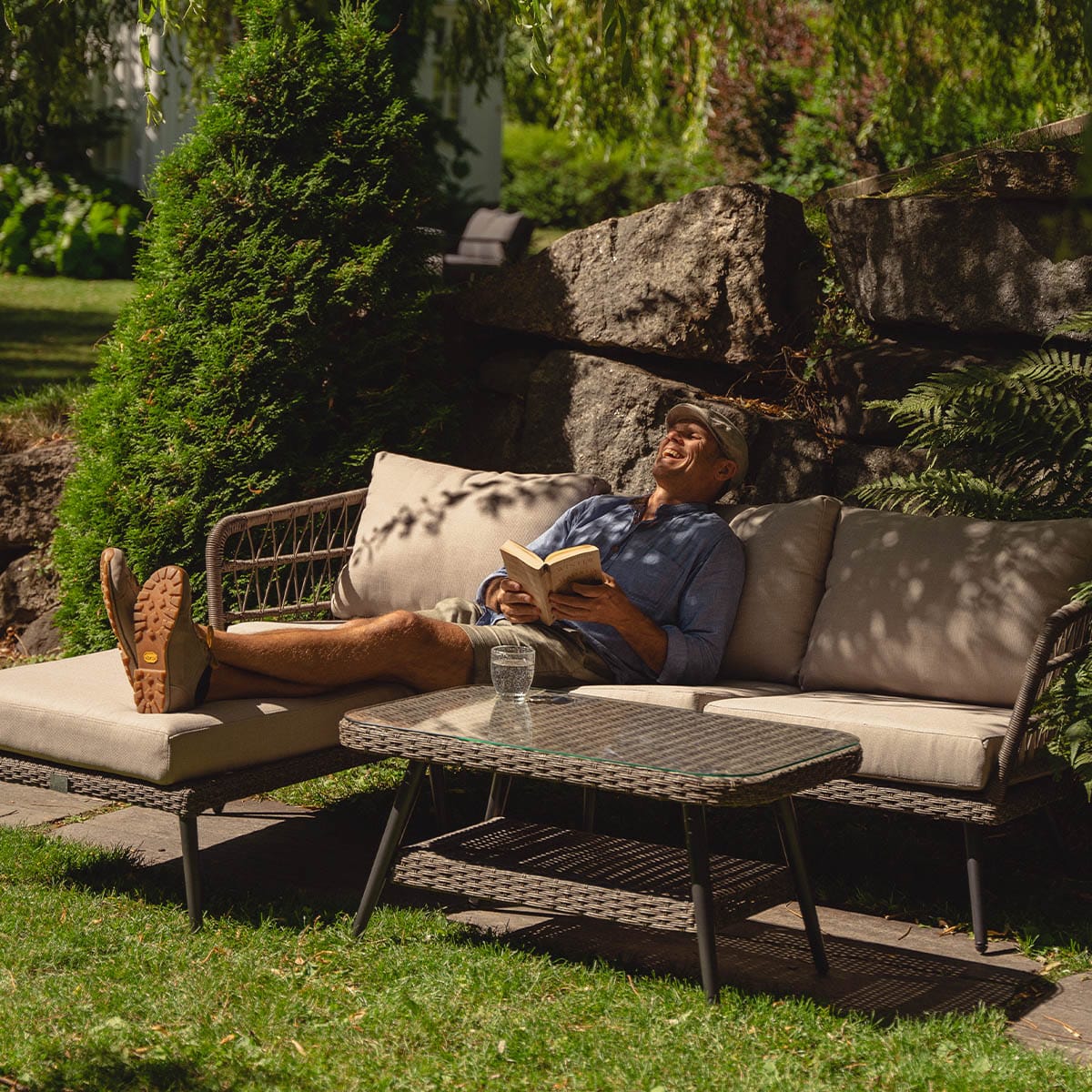 Lev livet utendørs i sommer! Sofagruppe bestående av en 3-seter sofa, sjeselongdel og bord med glassplate. Settet i rotting har et romantisk, men samtidig moderne uttrykk som passer både på balkongen, på uteplassen eller under et tre i hagen. Med ramme av pulverlakkert aluminium og åpen flett i kunstrotting, er det kun vask med mildt såpevann som kreves for at møblene skal holde seg fine år etter år. Lattefargede puter i olefinstoff, et materiale som er svært uv-bestandig og hurtigtørkende. Vi anbefaler likevel at putene legges under tak når de regner. Mål: 3-seter sofa L210xD74 cm H73 cm Sjeselongdel L60xD46 cm H45 cm Bord 90x55 cm H45 cm