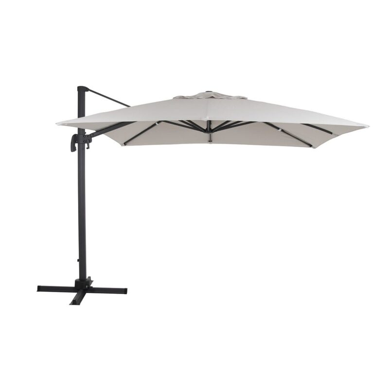 Dette er en fritthengende parasoll av høy kvalitet. Parasollduken er laget av 250 g polyester, og parasollen har et aluminiumstativ med sveiv og stegløs regulering. Parasollen kommer med fotkryss, og må forankres med parasollsteiner eller liknende. Disse må kjøpes løst. Parasollens mål er 3x3 meter.
