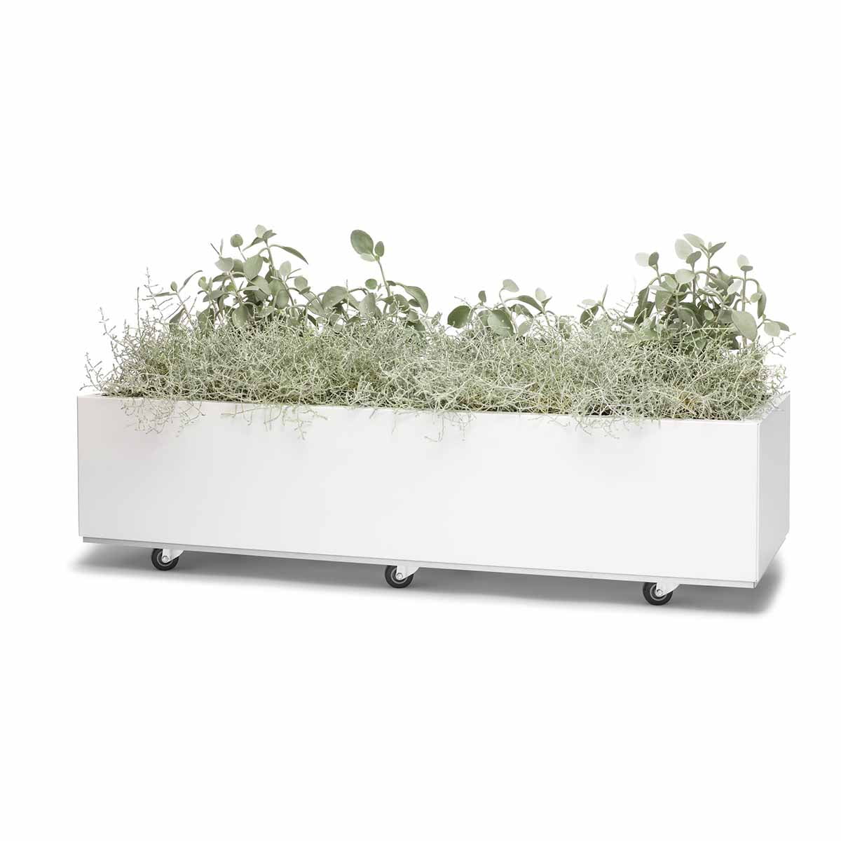 En lang, elegant kasse med god plass til flere planter i kombinasjon. Også flott som kjøkkenhage på hjul!. Designet i Norge, produsert i Sverige. Rustfri, frostsikker og 100% norsk. BEDD er et norsk selskap som utvikler vakre og varige plantekasser for norske forhold. Paneler og drenerende bunnplater er i 1mm rustfritt stål, og alle lakkerte paneler har en svært robust utendørs lakk som holder seg like pen i tiår. Kasser på hjul er praktiske å flytte rundt og sparer terrassen din for merker etter krukker og kasser som står rett på underlaget.